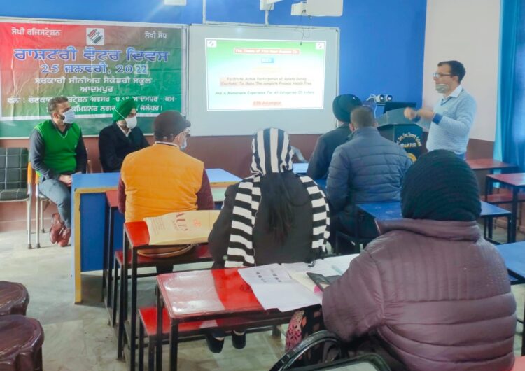 ਆਦਮਪੁਰ 25 ਜਨਵਰੀ (ਰਣਜੀਤ ਸਿੰਘ ਬੈਂਸ)-ਆਦਮਪੁਰ ਵਿਧਾਨ ਸਭਾ ਦੇ ਚੋਣਕਾਰ ਰਜਿਸਟ੍ਰੇਸ਼ਨ ਅਫ਼ਸਰ ਮੈਡਮ ਜਯੋਤੀ ਬਾਲਾ ਮੱਟੂ ਦੀ ਅਗਵਾਈ ਵਿੱਚ ਸਰਕਾਰੀ ਸੀਨੀਅਰ ਸੈਕੰਡਰੀ ਸਕੂਲ ਆਦਮਪੁਰ ਵਿਖੇ ਰਾਸ਼ਟਰੀ ਵੋਟਰ ਦਿਵਸ ਮਨਾਇਆ ਗਿਆ । ਇਸ ਸਬੰਧੀ ਜਾਣਕਾਰੀ ਦਿੰਦੇ ਹੋਏ ਨੋਡਲ ਅਧਿਕਾਰੀ ਬ੍ਰਿਜ ਲਾਲ ਤੇ ਬਲਜੀਤ ਸਿੰਘ ਢਿੱਲੋਂ ਨੇ ਦੱਸਿਆ ਕਿ ਸਭ ਤੋਂ ਪਹਿਲਾਂ ਚੋਣ ਕਮਿਸ਼ਨ ਪੰਜਾਬ ਦੇ ਆਨਲਾਈਨ ਪ੍ਰੋਗਰਾਮ ਵਿਚ ਸ਼ਮੂਲੀਅਤ ਕੀਤੀ ਗਈ । ਇਸ ਉਪਰੰਤ ਪ੍ਰਮੁੱਖ ਟ੍ਰੇਨਰ ਸੰਦੀਪ ਸਾਗਰ ਵਲੋਂ ਇਸ ਵਾਰ ਦੀਆਂ ਚੋਣਾਂ ਦੀ ਪ੍ਰਕਿਰਿਆ ਨੂੰ ਸਮਝਾਇਆ ਗਿਆ । ਵੋਟਰ ਜਾਗਰੂਕਤਾ ਸਬੰਧੀ ਪ੍ਰਣ ਲਿਆ ਗਿਆ । ਇਸ ਮੋਕੇ ਪ੍ਰਿੰਸੀਪਲ ਰਾਮ ਆਸਰਾ, ਬੀ ਡੀ ਪੀ ਓ ਸੰਦੀਪ ਸਿੰਘ, ਨੋਡਲ ਅਫ਼ਸਰ ਰਵਿੰਦਰਪਾਲ ਸਿੰਘ , ਲੈਕਚਰਾਰ ਗੁਰਿੰਦਰ ਸਿੰਘ, ਕਮਲਜੀਤ, ਅਮਰਜੀਤ ਸਿੰਘ, ਰਾਜ ਕੁਮਾਰ , ਸਮੂਹ ਬੂਥ ਅਫ਼ਸਰ ਤੇ ਸਮੁੱਚਾ ਸਟਾਫ਼ ਹਾਜਿਰ ਸੀ ।
